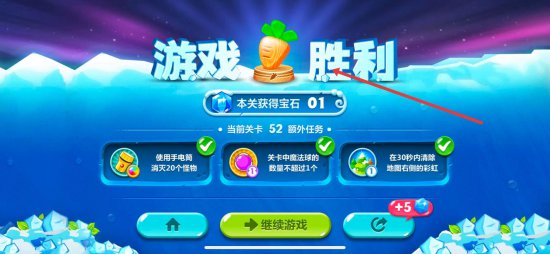 5、达成胜利条件后,界面显示游戏胜利,可查看本关获得宝石及额外任务完成情况,成功通过52关。