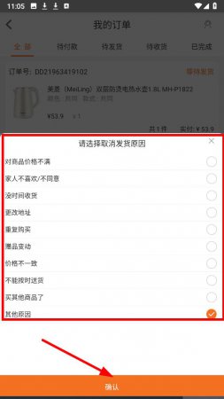 3、点击取消发货后,会弹出取消发货原因的窗口,里面有多个选项,按需勾选原因后,点击窗口下方的确认按钮,即可尝试取消订单。