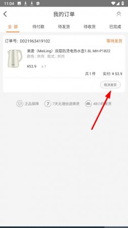 2、在我的订单页面找到想要取消的订单,点击该订单右侧的取消发货按钮,进入取消订单操作流程。