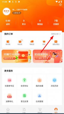 1、打开惠家有购物APP,点击底部导航栏中的我的,进入个人中心页面,点击我的订单查看全部。
