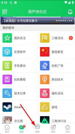 1、打开葫芦侠应用,点击底部导航栏中的网游选项,进入网游页面。