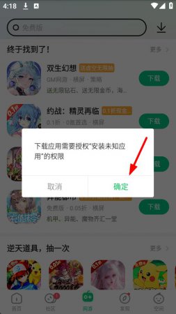 3、若弹出“下载应用需要授权‘安装未知应用’的权限”提示,点击确定进行授权。