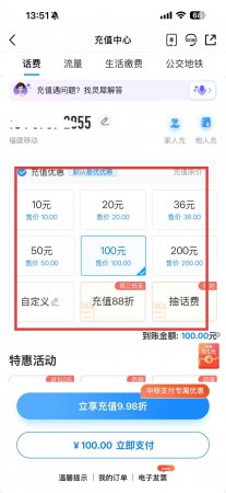 3、选择想要充值的金额,如10元、50元、100元等,也可以点击自定义输入特定金额,同时可留意是否有充值优惠活动。