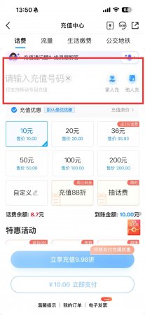 2、在充值中心页面上方的输入框中,输入需要充值的手机号码,支持为家人或他人充值。