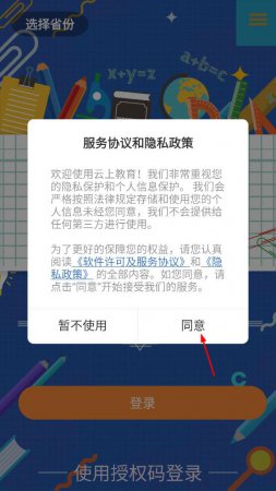 1、打开智慧云同步课堂App,在服务协议和隐私政策页面,点击“同意”按钮。