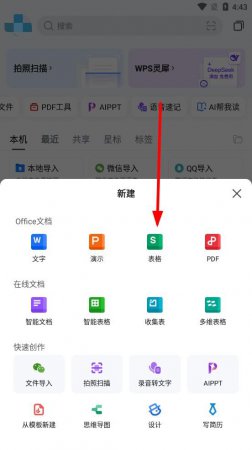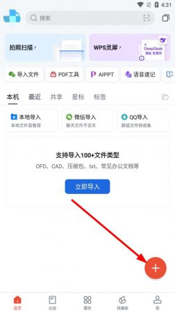 1、打开WPS Office APP,在首页点击右下角的+号。
