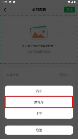 5、在弹出的列表中选择摩托车,接着完善车辆名称、车型等其他信息后,点击添加即可完成摩托车的添加。