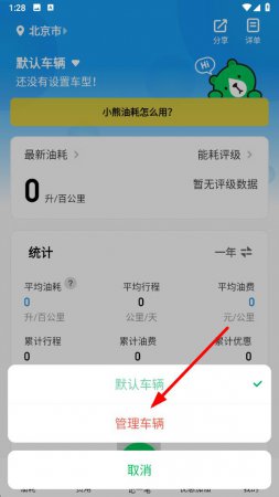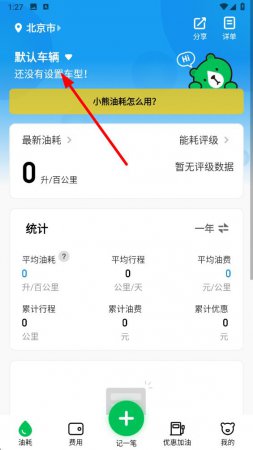 1、打开小熊油耗APP,在主界面点击默认车辆选项。