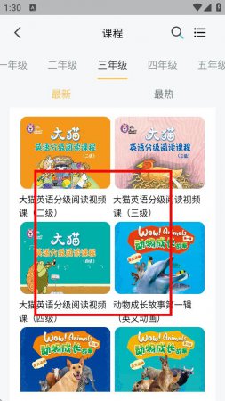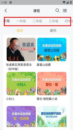 3、在课程页面上方,会显示年级分类标签,比如一年级、二年级等,点击对应的年级标签,即可筛选出该年级的课程。