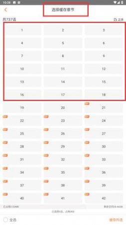 4、在选择缓存章节的页面内,选择你要缓存的集数,点击即可开始缓存。