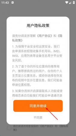 1、打开探探APP,弹出用户隐私政策提示,认真阅读相关内容后,点击“同意并继续”按钮,进入登录界面。