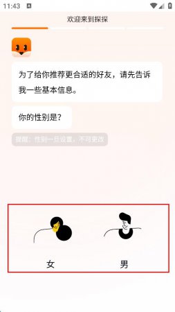 3、完成登录后,进入信息设置页面,首先需要设置性别,根据自身情况,在“女”和“男”选项中选择其中一个。