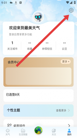 1、打开最美天气APP的软件,进入我的页面,点击右上角六边形设置的图标,进入设置的界面。
