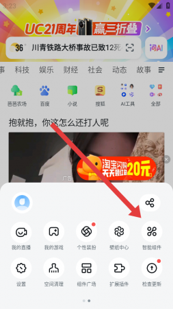 1、打开UC浏览器APP,进入首页后点击底部导航栏中间的菜单按钮,在弹出的功能菜单中找到并点击智能组件图标。