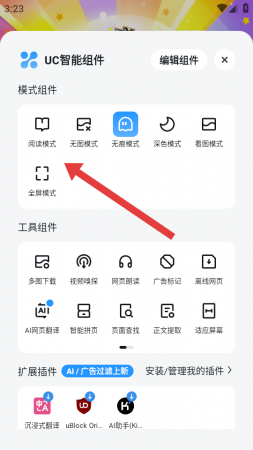 2、进入UC智能组件页面后,在模式组件区域找到并点击阅读模式的图标,启用阅读模式功能。