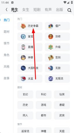 3、选择感兴趣的小说题材,比如历史争霸,进入该题材小说列表页面。