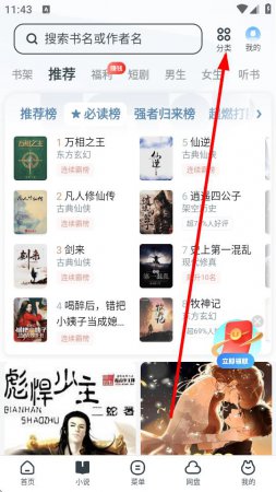 2、在小说界面中,点击右上方的分类按钮,筛选想看的小说类别。