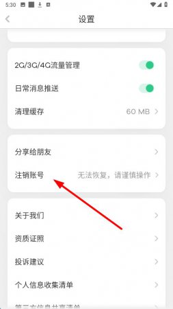 3、在设置页面里,下滑找到注销账号选项,点击它并按照页面提示谨慎操作,即可申请注销账号。