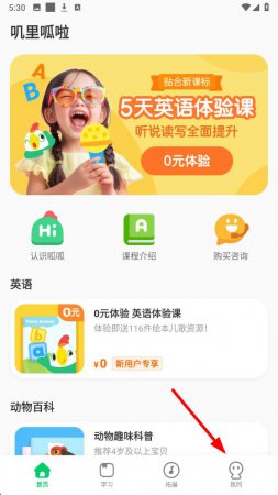 1、打开叽里呱啦app进入首页后,点击底部导航栏中的我的图标,进入个人相关界面。