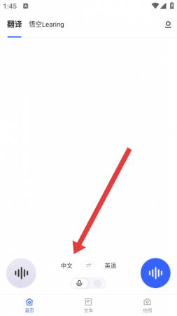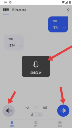3、回到前面的页面,点击左侧麦克风说出需要翻译的内容,右侧麦克风可播放翻译后的语音。