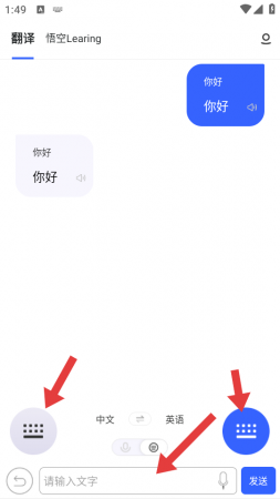 4、切换文字输入功能,点击请输入文字输入框,输入要翻译的文本点击发送,获取文字翻译结果。