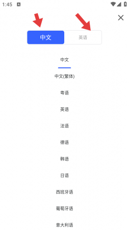 2、在语言选择界面,分别点击中文、英语等选项,设置需要翻译的源语言和目标语言。