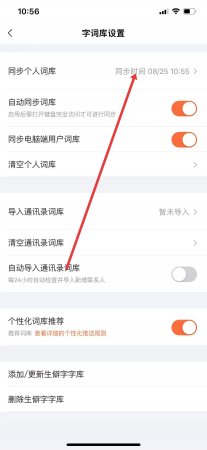 3、在字词库设置页面,点击自动同步词库开关,即可同步时间,完成个人词库同步。