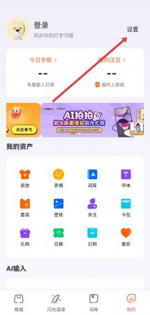 1、打开搜狗输入法,切换至底部导航栏的我的页面,在页面找到设置按钮并点击,进入设置界面。