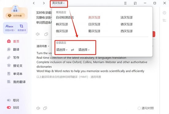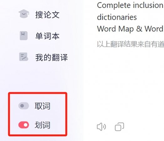 1、在有道词典面板的左下角选择 “取词”和“划词”按钮。