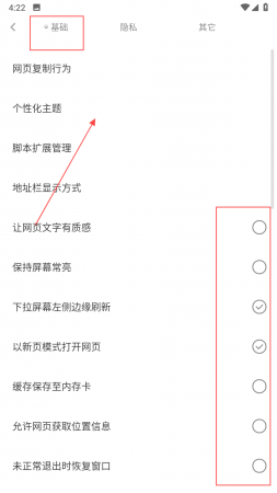 1、进入设置中的基础设置界面,能看到网页复制行为、个性化主题等选项,勾选下拉屏幕左侧边缘刷新,以新页模式打开网页等选项,可按个人偏好调整网页浏览的基础交互。