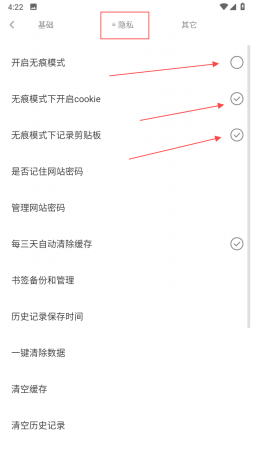 2、切换到隐私设置界面,可对隐私相关选项进行操作,若想保护浏览隐私可勾选开启无痕模式,还能设置无痕模式下是否开启cookie、是否记录剪贴板,以及管理网站密码等。