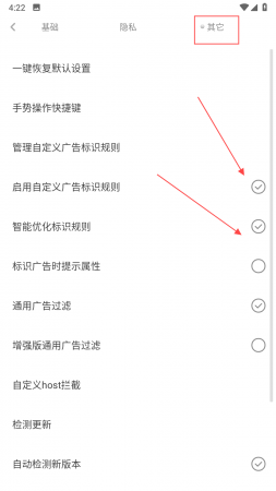 3、在其它设置界面,可进行一键恢复默认设置、管理手势操作快捷键等操作,勾选启用自定义广告标识规则,智能优化标识规则,通用广告过滤等选项,能有效过滤广告。