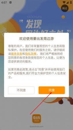 1、打开要出发周边游App,弹出服务条款和隐私政策提示弹窗,点击“同意”按钮,进入App主界面。