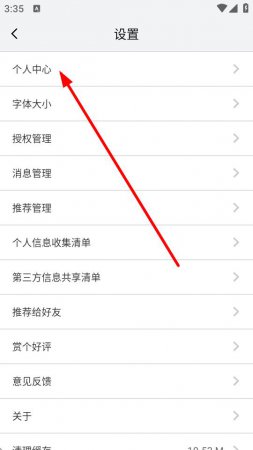 3、进入设置页面后,点击个人中心选项。