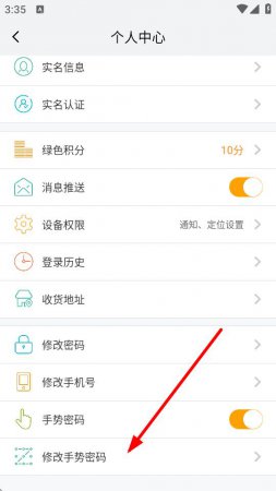 4、在个人中心页面里,找到并点击修改手势密码选项,然后按照提示操作,绘制新的手势密码并确认,即可完成修改。