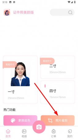 1、打开证件照美颜版APP,在首页热门功能区域,点击照片裁剪按钮。