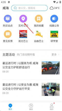 2、在APP主界面,点击实时公交选项,进入实时公交页面,可查看不同城区的公交信息。