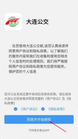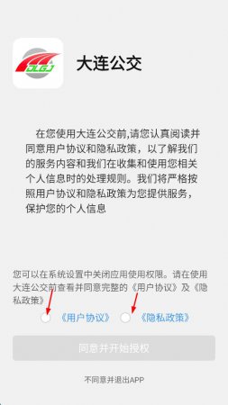 1、打开大连公交APP,在用户协议和隐私政策确认页面,先勾选用户协议,再勾选隐私政策,然后点击“同意并开始授权”按钮。