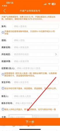 3、在开通产业带商家账号页面,按要求依次填写信息,注意各项填写规范提示,填写完毕后点击底部下一步按钮,按后续指引完成注册。