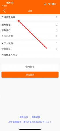 2、在设置界面中,点击开通卖家功能选项,即可进入商家账号开通流程。