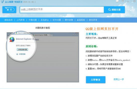 安装金山毒霸并打开电脑医生,搜索“QQ能上但网页打不开”,点击“立即修复”。