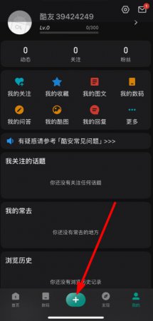 1、打开酷安App,点击底部导航栏中间的+号按钮。