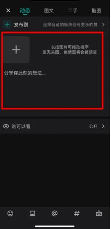 2、在发布页面,输入你想要分享的内容,可添加图片等素材。