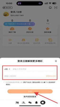 3、输入手机号码,点击获取验证码,填写收到的短信验证码,勾选用户协议、隐私政策等,点击登录。