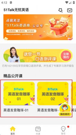 3、在51Talk无忧英语主页面,找到“精品公开课”板块,选择要学习的课程,比如“英语发音雕琢-01”,进入该课程页面。