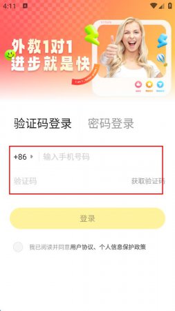 1、打开51Talk无忧英语软件,进入登录页面,选择“验证码登录”,在“输入手机号码”栏填写自己的手机号,然后点击“获取验证码”,将收到的验证码输入到“验证码”栏。