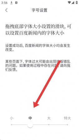 3、在字号设置页面,拖拽底部的滑块可以选小、中、大、特大,即可调整百度新闻内的字体大小。