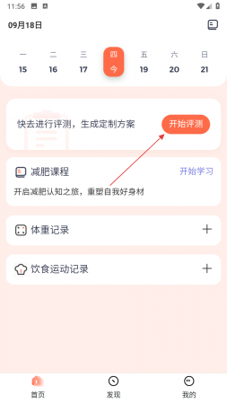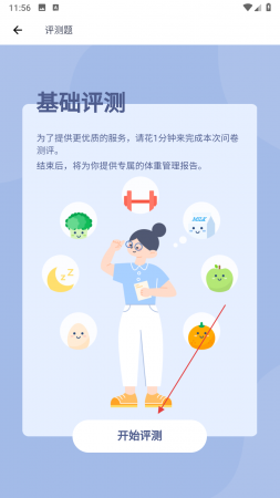 1、打开薄荷营养师APP,找到基础测评入口,进入展示基础测评介绍的页面。