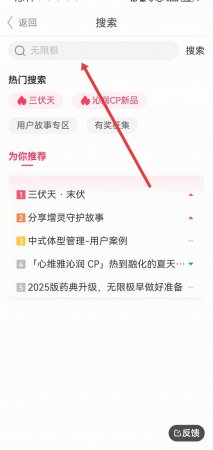 2、在搜索页面,需要点击搜索框,输入关键词如三伏天、无限极等,可以选择检索相关资讯或产品信息。
