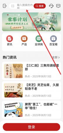 1、进入无限极最新版APP的首页,点击顶部搜索栏,跳转至搜索界面,可以查找资讯、产品等内容。